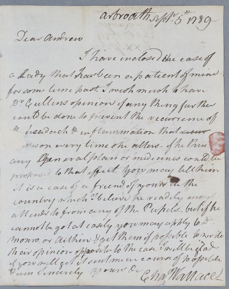 Letter from Charles Wallace concerning the case of an unnamed female patient. Addressed to Andrew Kenney, care of Robert Ross, James Court, Edinburgh with the request to pass it to Cullen for his opinion.