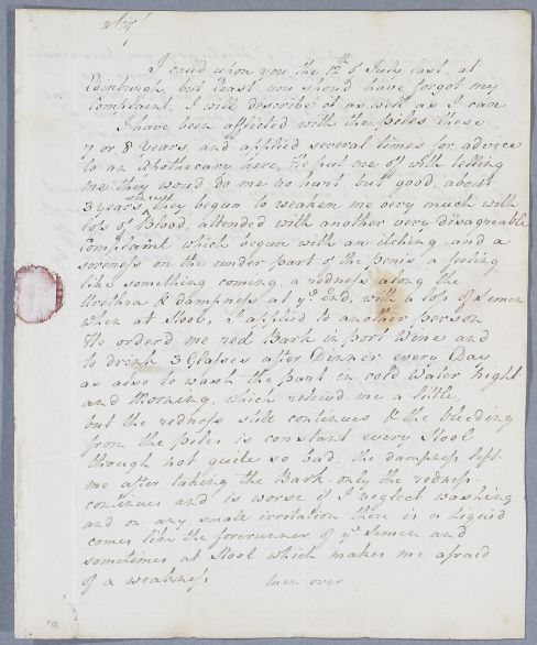 | Summary | Letter from William Flintum, concerning his own case, on which he had consulted Cullen in person in July (Doc ID 5856 is his prescription from that consultation). He has suffered from piles for several years, without much help from his apothecary, and now has a seminal emission when at stool. The date on the annotation is October 1789: according to Doc ID 5907, Cullen believed Mr Flintum had misdated his letter. |