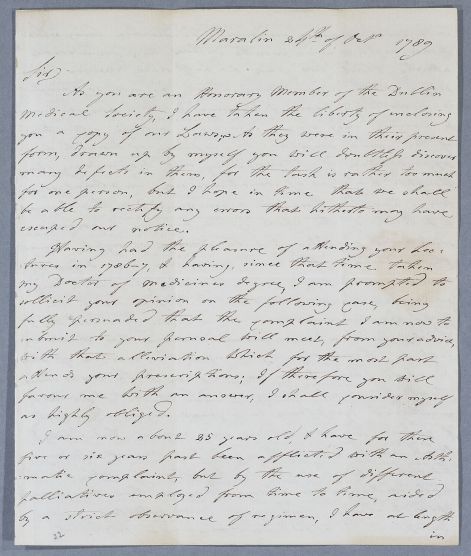 Letter from the Revd Dr Brab Smith, a former student of Cullen's. He writes to Cullen because Cullen is an honorary member of the Dublin Medical Society. He encloses a copy of the Society's laws for Cullen's comments (not included) (published in 1789). He also asks about his own case. Mentions Dr Thomas Withers' "Observations on Chronic Weakness".