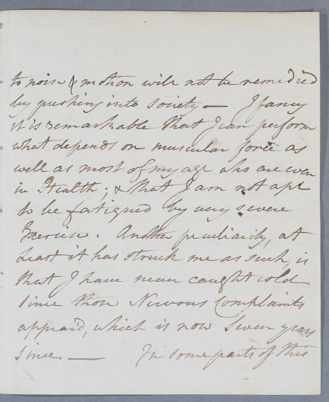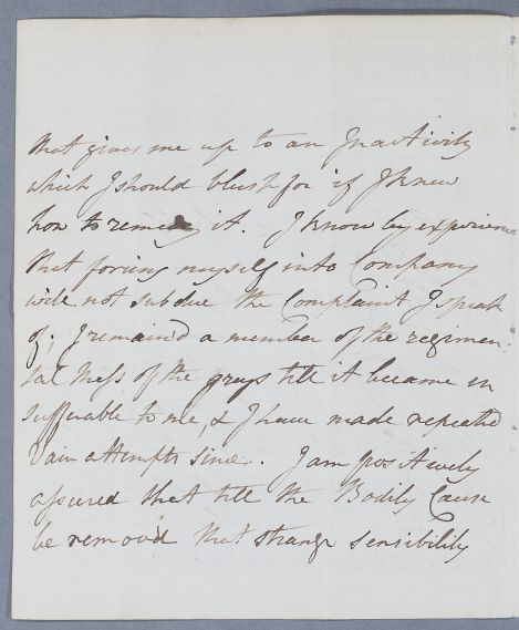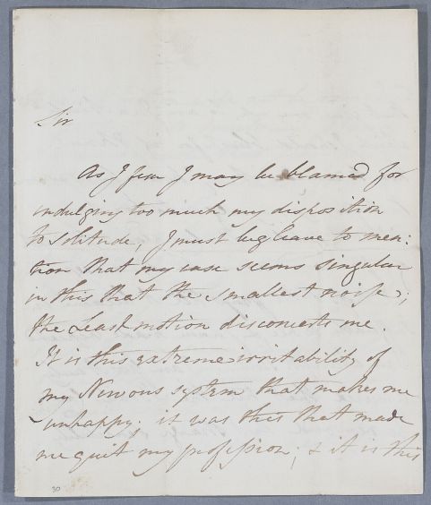 Letter from A. Sandilands, concerning the patient's own case. 'As I fear I may be blamed for indulging too much my disposition to solitude, I must beg leave to mention that my case seems singular in this that the smallest noise, the Least motion disconcerts me'.