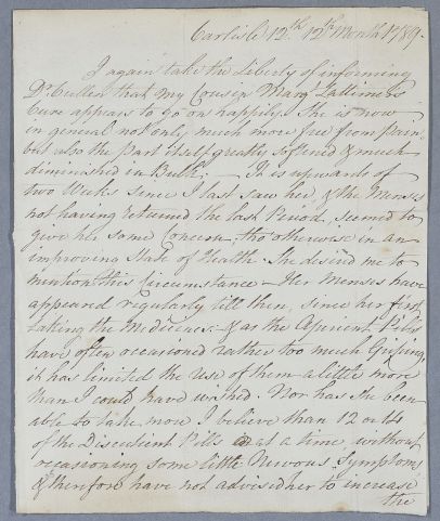 | Summary | Letter from S. James concerning the case of his cousin, Margaret Lattimer. |