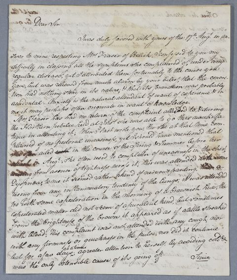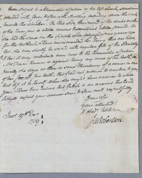 | Summary | Letter from James Robertson, concerning the case of Mrs Fraser of Relick. Mrs Fraser's symptoms include a feeling of tightness in the breast, breathlessness and spitting blood which recedes upon guarding against cold. Mrs Fraser has also developed sponginess and bleeding in her gums. Robertson recommended an extraction of a decaying tooth, but Mrs Fraser is afraid of losing too many teeth. |