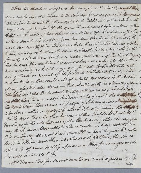 Letter from James Robertson, concerning the case of Mrs Fraser of Relick. Mrs Fraser's symptoms include a feeling of tightness in the breast, breathlessness and spitting blood which recedes upon guarding against cold. Mrs Fraser has also developed sponginess and bleeding in her gums. Robertson recommended an extraction of a decaying tooth, but Mrs Fraser is afraid of losing too many teeth.