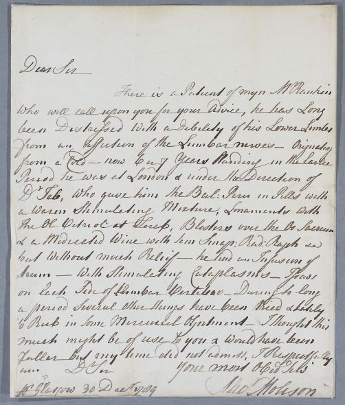 | Summary | Letter from Alexander Molison, concerning the case of Mr Rankin, who will be coming to visit Cullen. He has a debility of the legs, attributed to 'an affection of the Lumbar nerves', and has undergone various treatments. In London, he consulted Dr Jeb[b]. Molison's spelling is poor. The letter is marked 'N.A.' - 'No Answer'. |