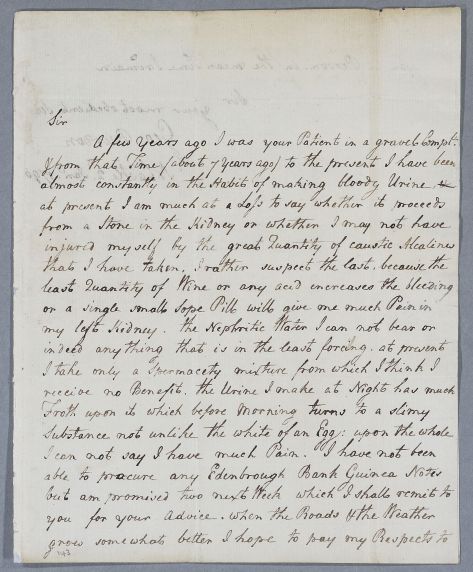 | Summary | Letter from George Burdon, describing his own case. Mr Burdon suspects he has injured himself by the great quantity of caustic alkalines he has taken. He describes the colour and consistency of his urine. |