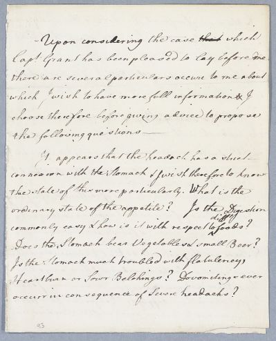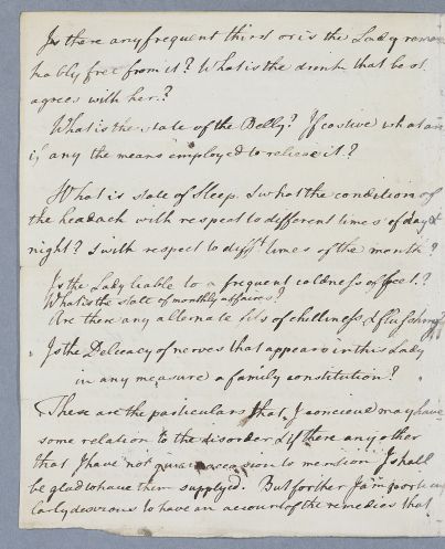 Letter by Cullen concerning the case of the female patient sent to him by Captain Grant. He asks a number of questions about the case, including whether there are any links between her headaches and her digestion and her menstrual cycle. Judging by previous letter, probably delivered c/o Captain Grant.