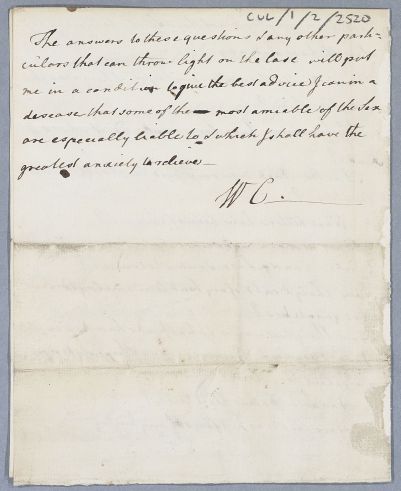 | Summary | Letter by Cullen concerning the case of the female patient sent to him by Captain Grant. He asks a number of questions about the case, including whether there are any links between her headaches and her digestion and her menstrual cycle. Judging by previous letter, probably delivered c/o Captain Grant. |