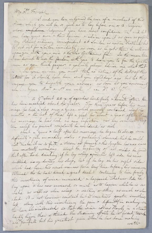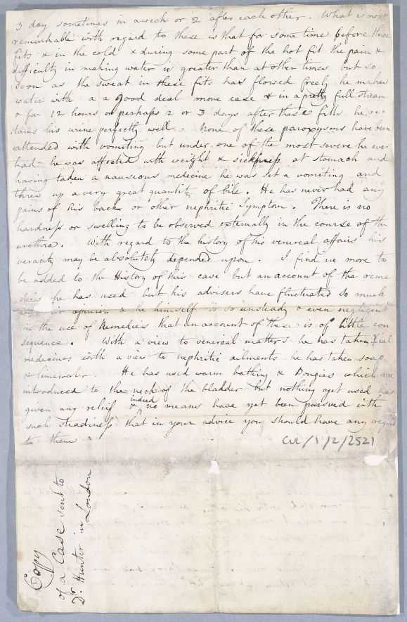 | Summary | Retained copy of a case of an unnamed male patient, sent by Cullen to Dr Hunter in London. Hunter's response, Document 3655, was addressed to Cullen when he was still at Glasgow, so an inferred date of 1754-55 at the latest. |
