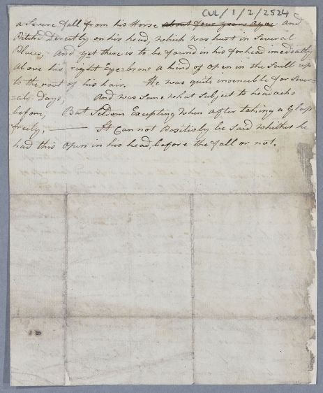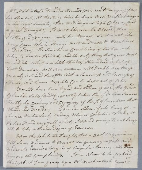 Unsigned case note describing the case of Mr Mackintosh, whose 'Disorder Proceeds (one would imagin) from his stomach', but suffers from severe megrains in the right temple. He has put on weight because of lack of exercise. The writer also mentions that 4 years previously, he had suffered head injuries falling from his horse, and that a fissure is palpable in the skull above the right eyebrow. The writer may be identifiable from handwriting and idiosyncratic spellings.
