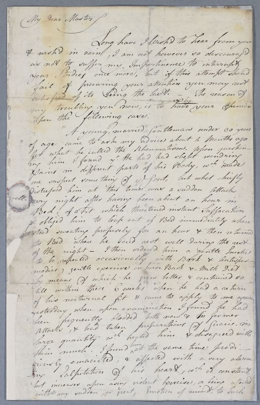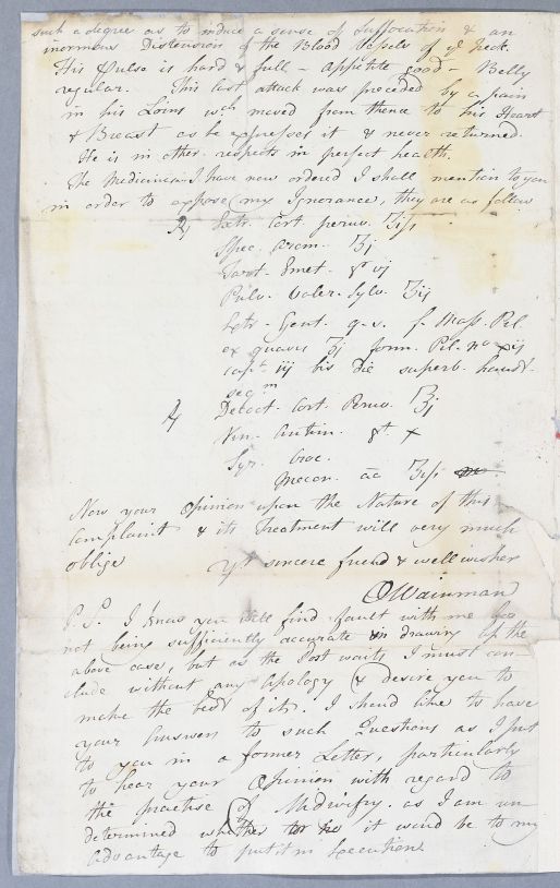 Letter from Dr Oglethorp Wainman, concerning the case of an unnamed male patient. No date, but Wainman, and Edinburgh graduate, mentions writing to Cullen earlier about his pursuing a career in midwifery [Untraced in CDB and GU Cullen papers]. Date inferred because Wainman is writing to Cullen over another case in May 1780 as if wishing to open-up a dialogue with his old 'master'.