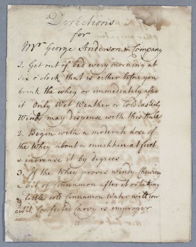 | Summary | Reply, in form of retained autograph draft, for George Anderson 'and Company' (meaning, in this context, and "his companions") who are given detailed directions of taking a course of goat whey. Undated. |