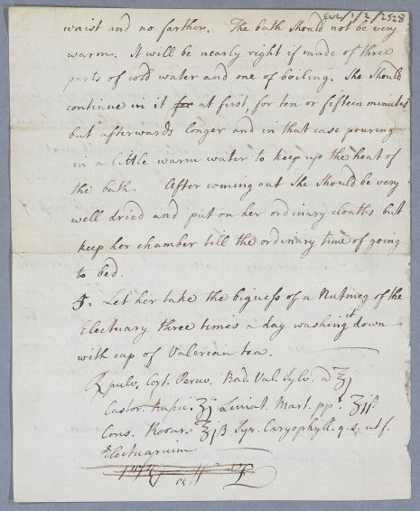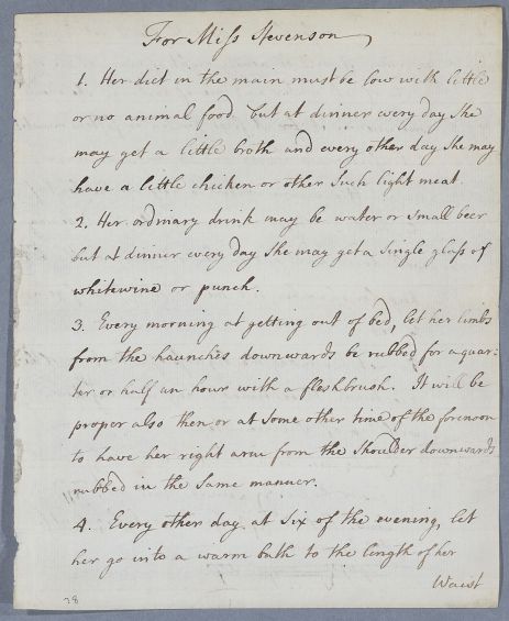 Reply, in the form of a retain autograph draft, with a regimen for Miss Stevenson. No date. The deletion of the name 'Mrs Bisset' on the same page is the only reason for speculating a date of 1774 (because a Mrs Bisset was a patient in that year).