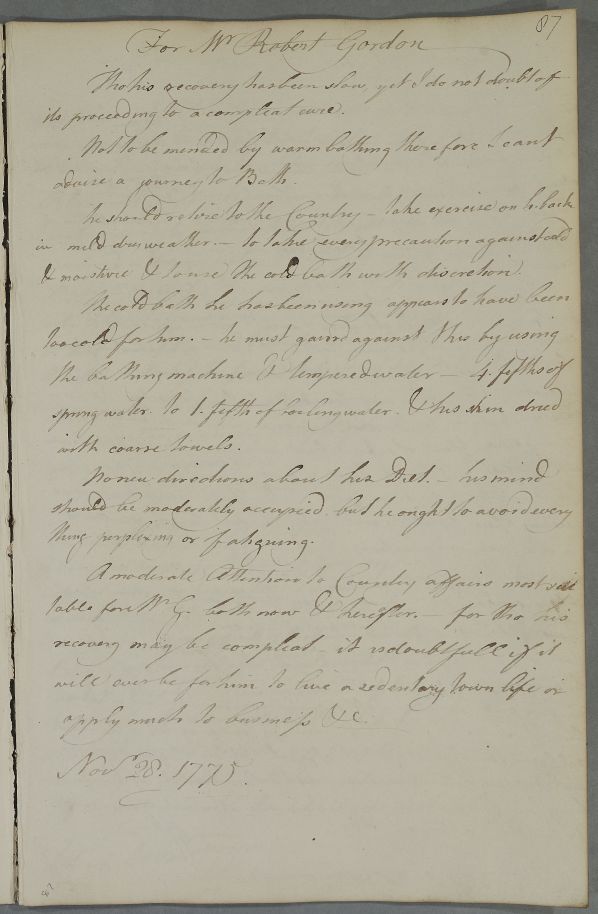 | Summary | Reply 'For Mr Robert Gordon'. Cullen recommends against a journey to Bath as the ailment is not to be mended by warm bathing; rather, the patient should exercise on horseback in mild dry weather, and guard against cold. |