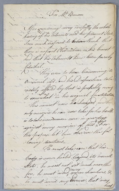 Reply, in the form of a retained scribal(?) copy of detailed regimen for Mr Benson who has 'a catharal disposition'.