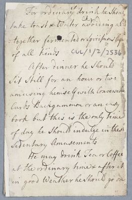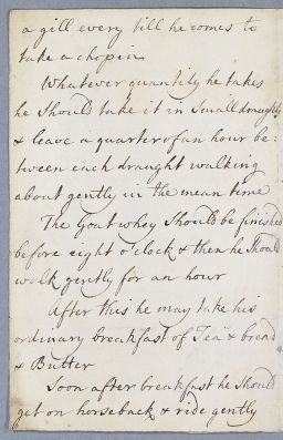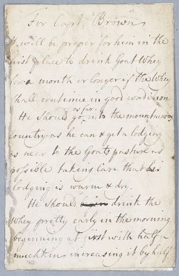 | Summary | Reply, in the form of retained autograph draft by Cullen advising Captain Brown to take a course of goat whey. |
