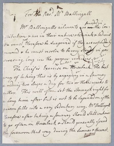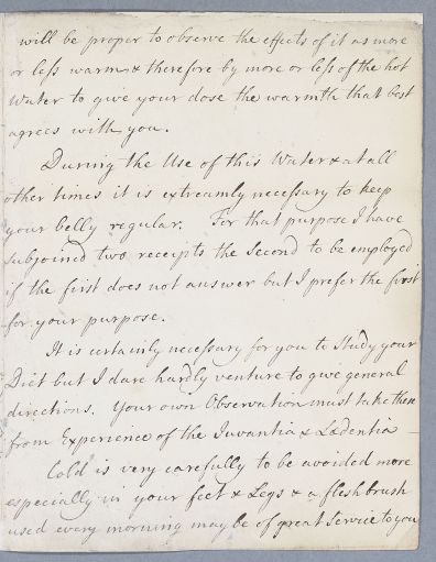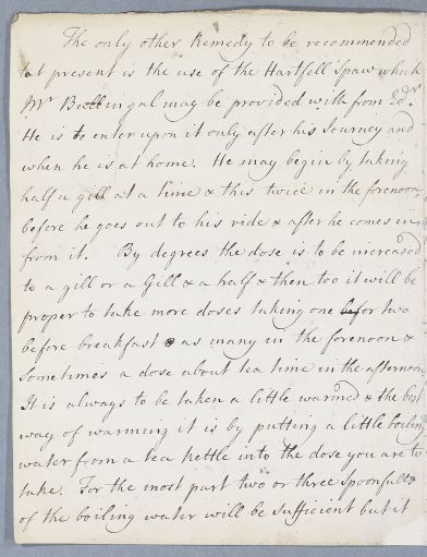 Reply, in the form of a retained draft by Cullen, providing a regimen for the Rev. Mr Ballingall (minster at Forglen by 1780). He is advised to take Hartfell Spa Water. Cullen assumes if necessary he is able to collect bottles of this at Edinburgh which suggests that Ballingall probably consulted Cullen in person when attending the General Assembly (which he is on record as doing in 1781).