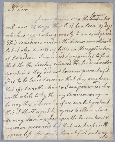 Reply, a retained copy in Cullen's hand, concerning the case of an unnamed male patient who is having leeches applied to his head for periodic 'fits. Cullen mentions a Mrs Paton and a story of 'old Dundonald's son'.
