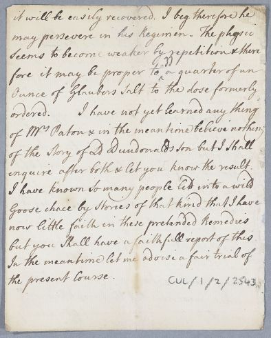 | Summary | Reply, a retained copy in Cullen's hand, concerning the case of an unnamed male patient who is having leeches applied to his head for periodic 'fits. Cullen mentions a Mrs Paton and a story of 'old Dundonald's son'. |