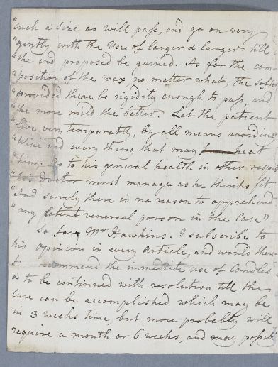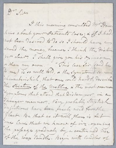 Letter from William Hunter concerning the case of an unnamed male patient, a Scottish merchant whose case was sent to him by Cullen (Doc: 3632). Hunter includes the opinion of Mr Hawkins. Addressed to Cullen at Glasgow so an inferred date of early 1755 at the latest. The only other letter in the archive addressed to Cullen while still at Glasgow is Doc:733.