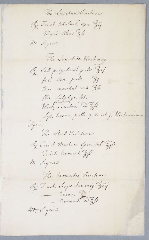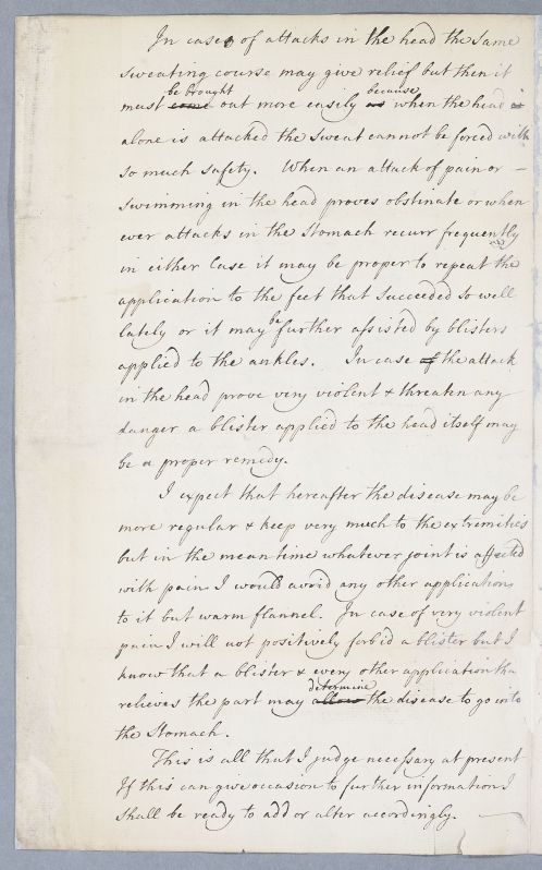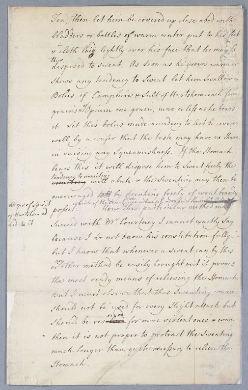 | Summary | Reply, in the form of the final pages of a retained authorial draft of directions for Mr Courtney. Missing first pages. Almost certainly for managing his gout. |