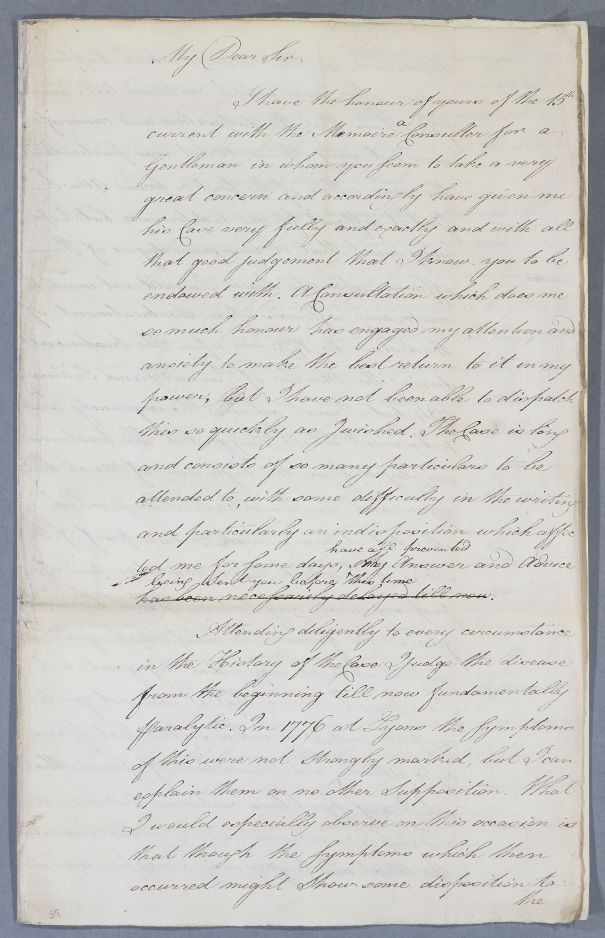 [ID:3665] From: Dr Suë / To: Dr William Cullen (Professor Cullen) / Regarding: Mr (Patient) / October? 1785? / (Incoming)