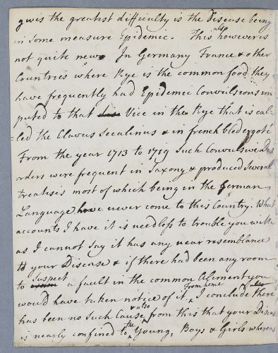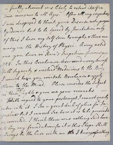 | Summary | Letter by Cullen to Dr Farguison who had been describing cases of 'louping ague' and whether it can be epidemic. Cullen cites cases he has known and refers his correspondent to a reported by Abraham Kaau Boerhaave, nephew of the famous medical teacher Hermann Boerhaaave. |