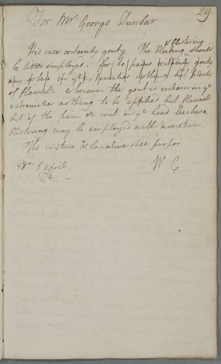 | Summary | Reply 'For Mr George Dunbar'. Concerning continued treatment for a 'gouty' condition. Response to the letter form Dunbar's nephew dated 16 March. |