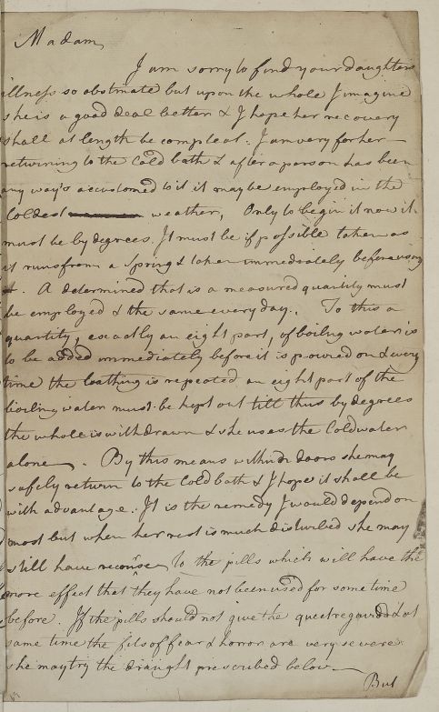 | Summary | Reply addressed to an unnamed correspondent concerning the case of her daughter Miss Lieth, who is suffering from 'fits of fear & horror'. Loose letter bound into case-book. |