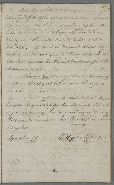 [ID:3705] From: Dr William Cullen (Professor Cullen) / To: Miss Stclair / Regarding: Miss Stclair (Patient) / 21 September 1774 / (Outgoing)