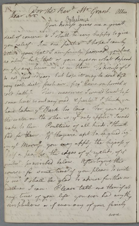 Reply 'For the Revd Mr Grant' in Alloa, written to Grant in person, containing advice and recipes for an eye-wash and ointment.
