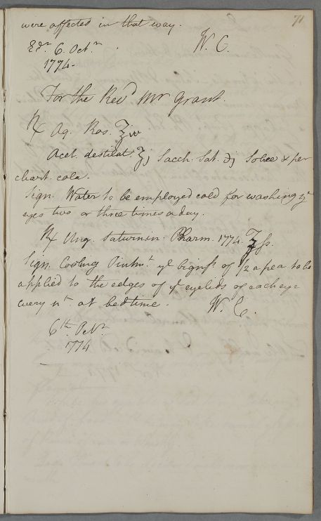 [ID:3707] From: Dr William Cullen (Professor Cullen) / To: Reverend Grant / Regarding: Reverend Grant (Patient) / 6 October 1774 / (Outgoing)
