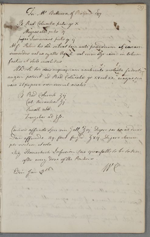 Take ten grammes of powdered Columbo root, a scruple of powdered calcined magnesia, two grammes of allspice. Mix and let the powder be taken twice a day, in the hour before dinner or it be attempted to be taken with a cup of water or in a piece of it folded into a ball with common syrup. Note: If this dose proves troublesome, you may be able to add fifteen to twenty grammes of columba root but not real magnesium together with the pepper and vinegar.