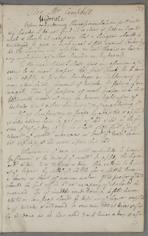 | Summary | Reply 'For Mr Campbell' giving detailed instructions of how to make and employ a suspensory bandage to ease his swollen testicle. |