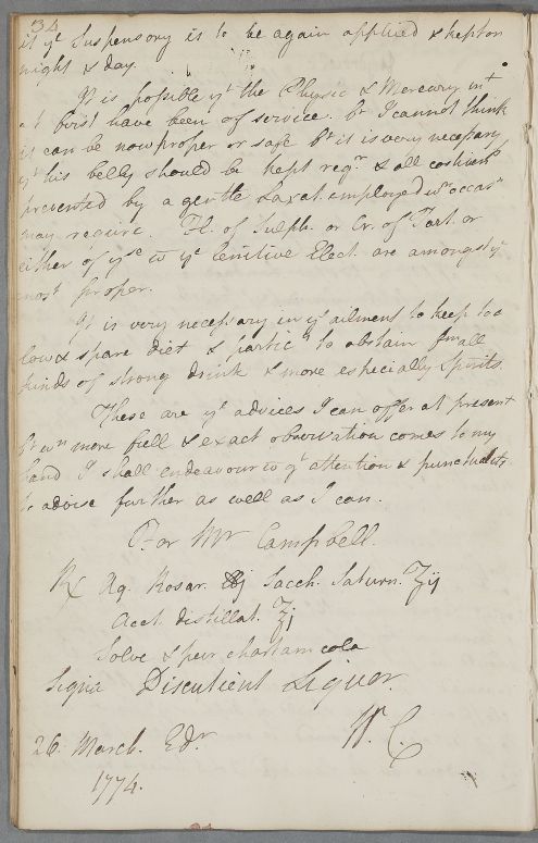 [ID:3755] From: Dr William Cullen (Professor Cullen) / To: [ADDRESSEE UNKNOWN] / Regarding: Mr Campbell (Patient) / 26 March 1774 / (Outgoing)