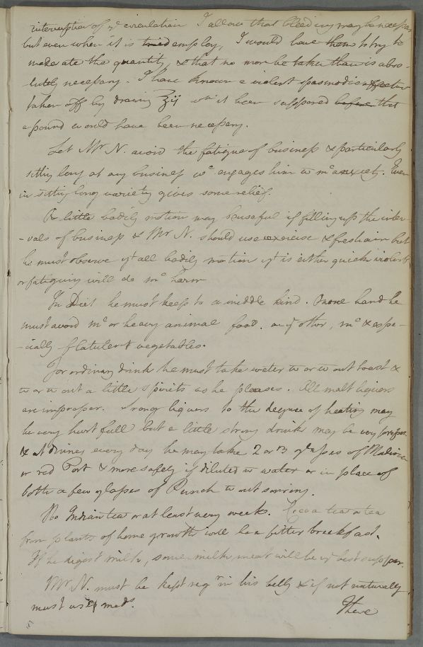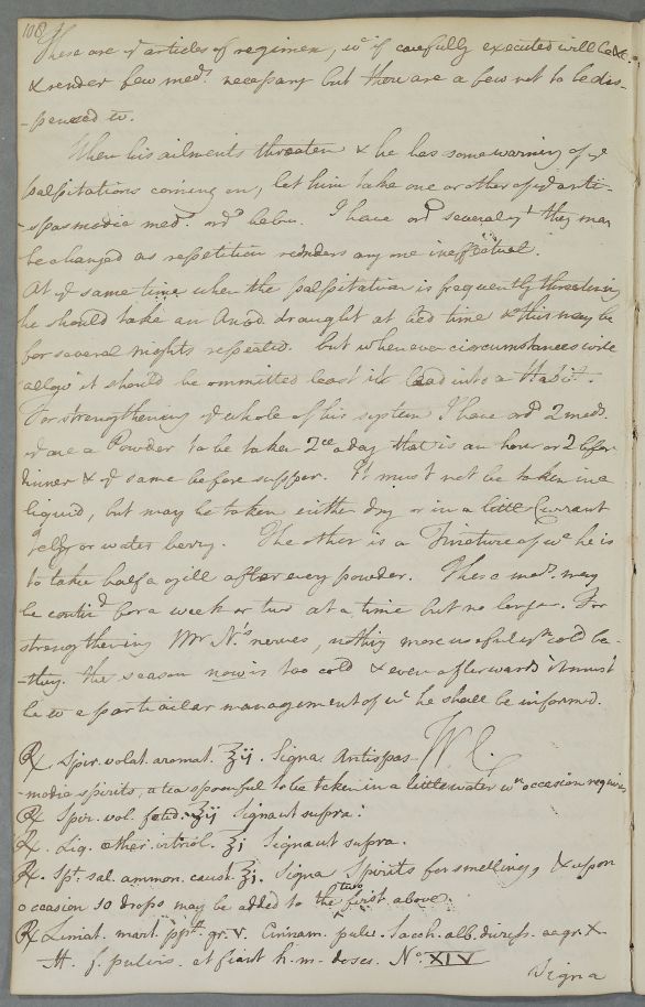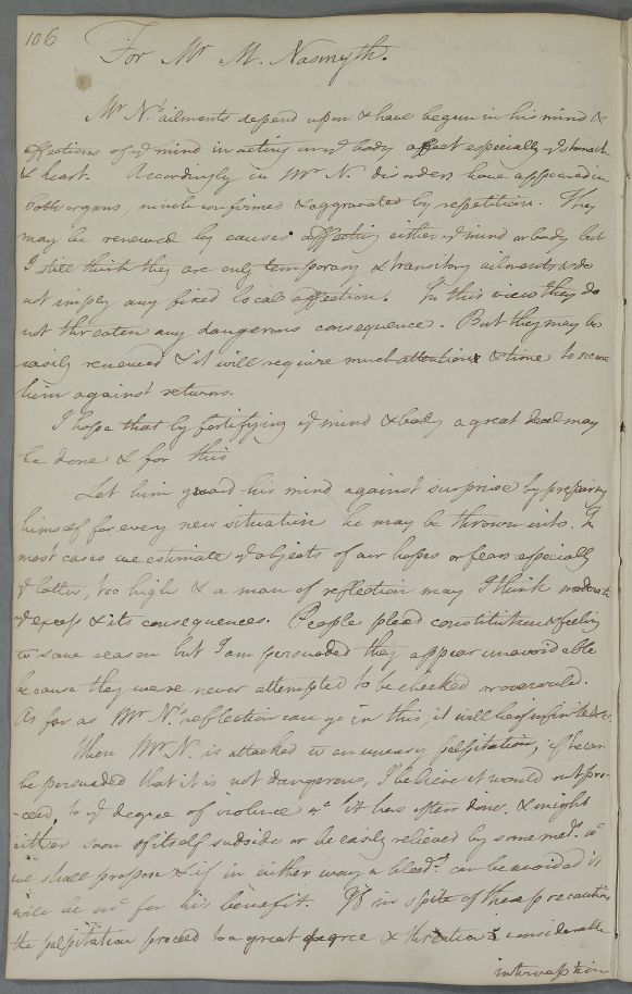 Reply 'For Mr M. Nasmyth', who suffers from palpitations and stomach ailments, which Cullen says 'depend upon & have begun in his mind & effections of the mind acting upon the body'. He gives advice on bleeding, diet and lifestyle, and recommends antispasmodic and strengthening medicines, for which he provides recipes.
