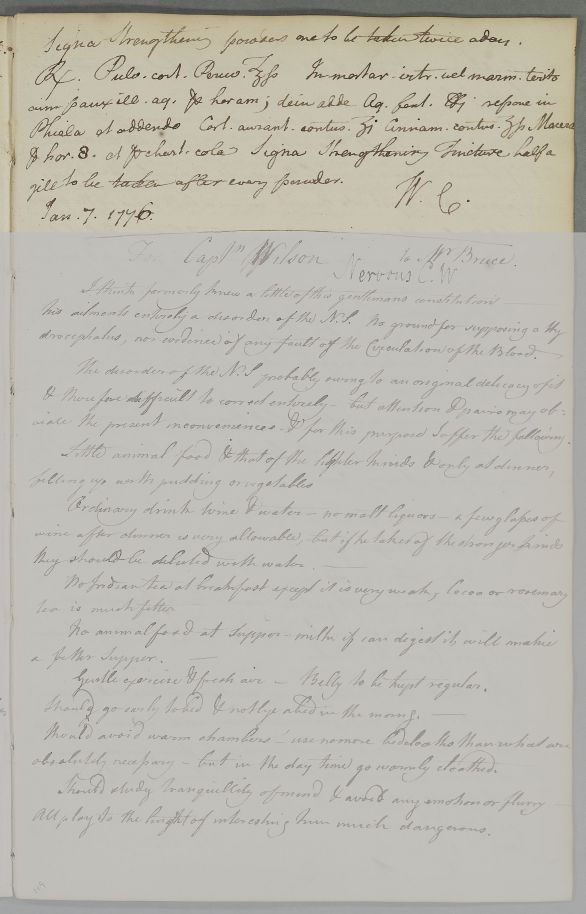 | Summary | Reply 'For Mr M. Nasmyth', who suffers from palpitations and stomach ailments, which Cullen says 'depend upon & have begun in his mind & effections of the mind acting upon the body'. He gives advice on bleeding, diet and lifestyle, and recommends antispasmodic and strengthening medicines, for which he provides recipes. |