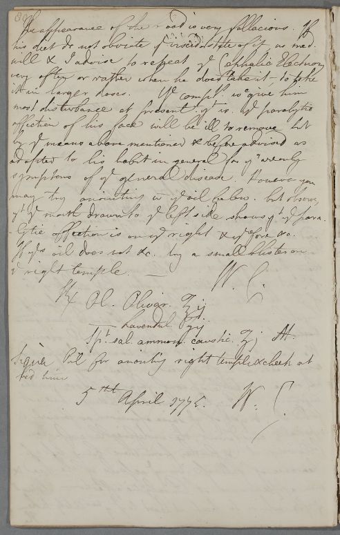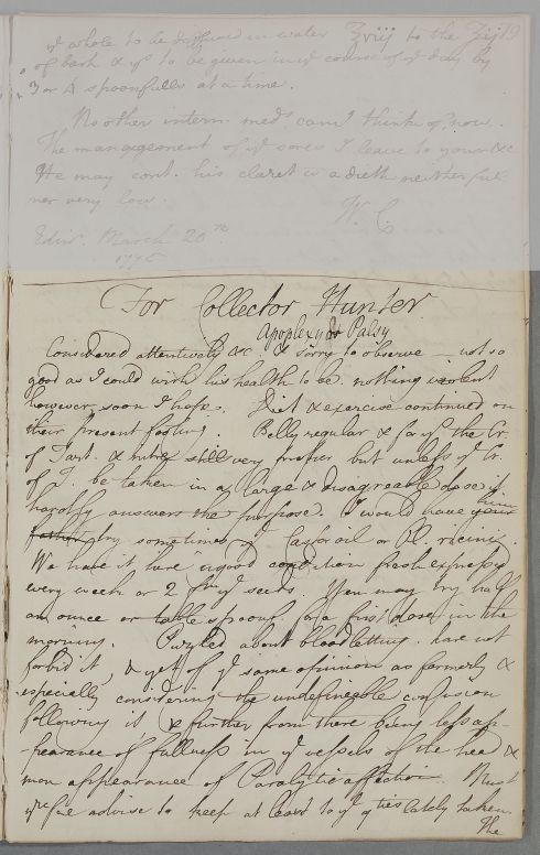 | Summary | Reply 'For Collector [Robert] Hunter'. One side of his face is paralysed. Cullen recommends the application of an oil, for which he gives a recipe, or, failing that, a blister on the temple. |