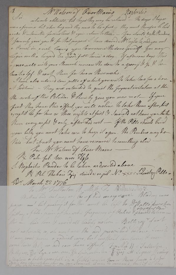 [ID:3787] From: Dr William Cullen (Professor Cullen) / To: Mr Watson (of OverMains) / Regarding: Mr Watson (of OverMains) (Patient) / 22 March 1776 / (Outgoing)
