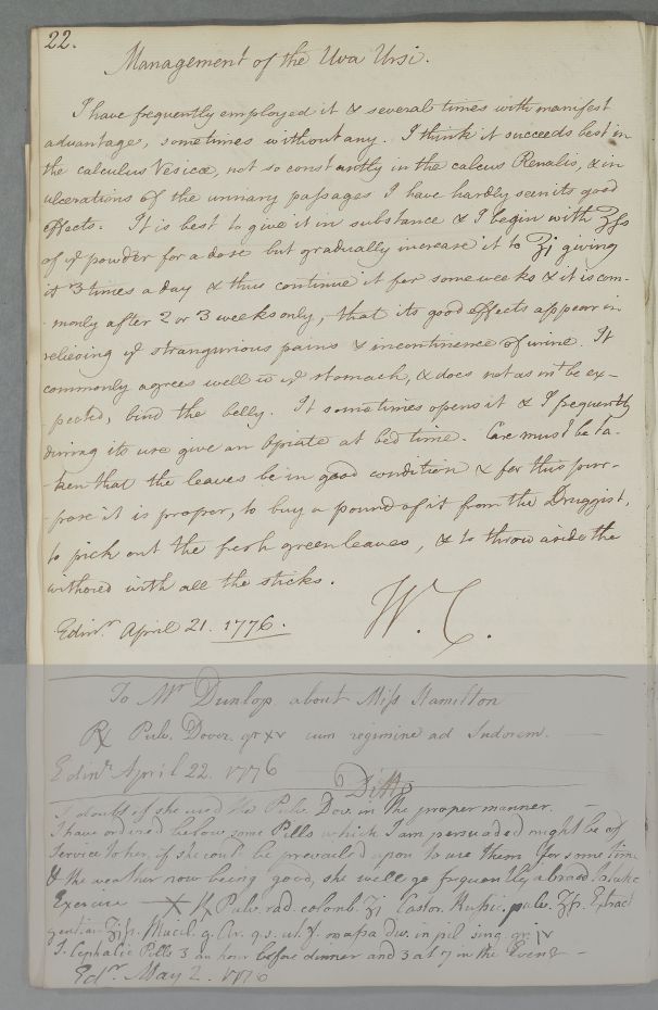 Reply in response to a request for information from Dr John Gilchrist in treating his patient, the surgeon Mr James Hill for calculus, headed 'Management of the Uva Ursi' [Bearberry Leaves], in which Cullen discusses his own use of them in such cases.