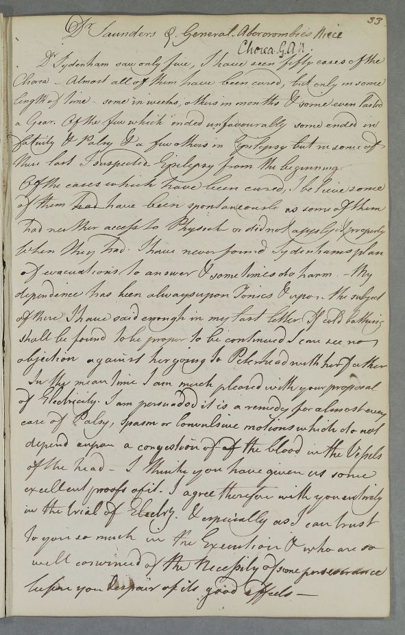 | Summary | Reply 'Dr Saunders Q. General Abercrombies Niece', approving of the use of electricity in cases of Chorea. |