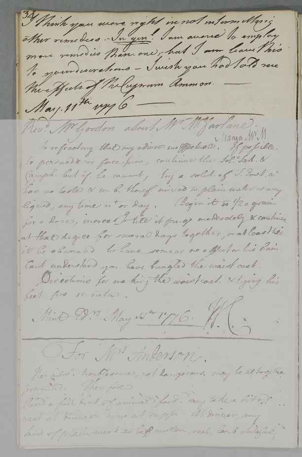[ID:3811] From: Dr William Cullen (Professor Cullen) / To: [ADDRESSEE UNKNOWN] / Regarding: Anonymous (Patient) / 11 May 1776 / (Outgoing)