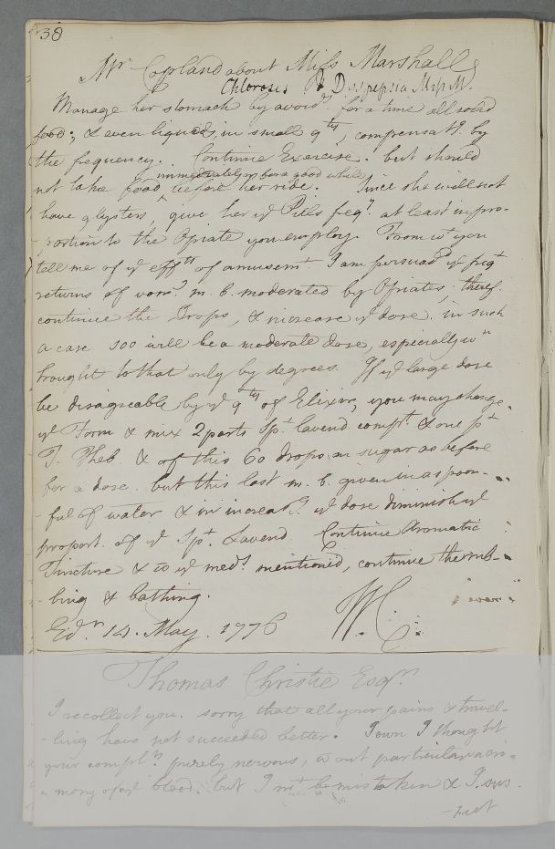 | Summary | Reply, 'Mr Copland about Miss Marshall', concerning Miss Marshall's Chlorosis and Dyspepsia. |