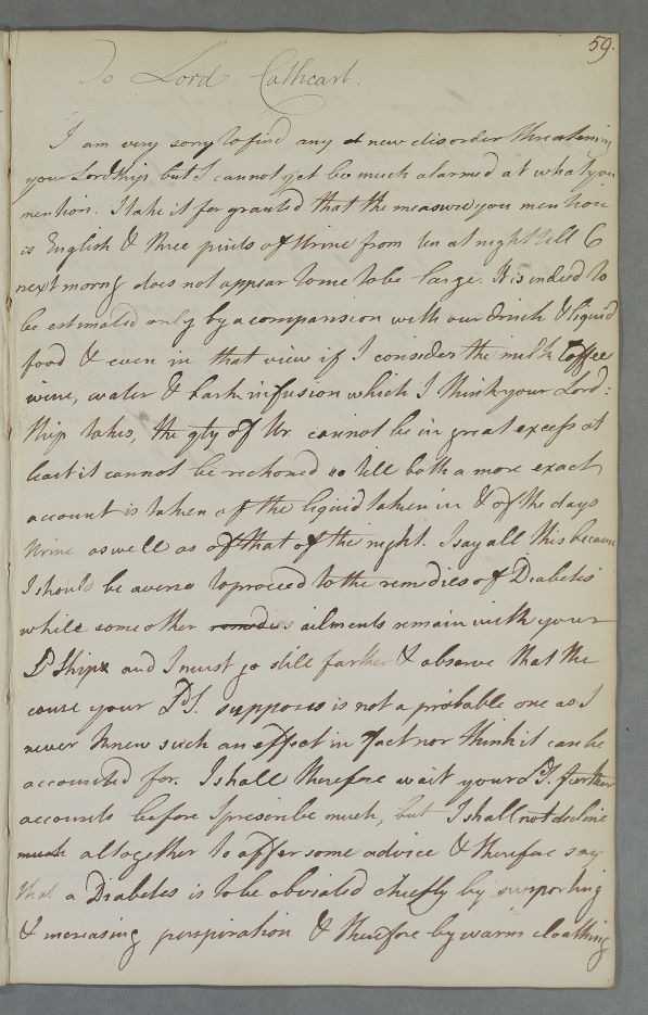 | Summary | Reply 'To Lord Cathcart', reassuring him about a perceived urinary disorder. |