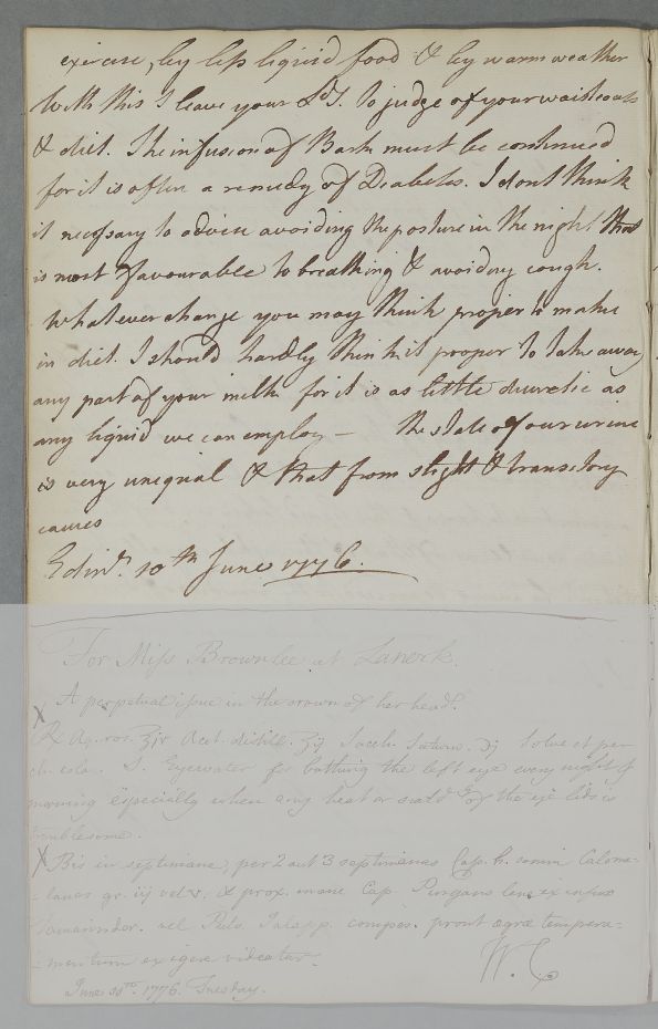 [ID:3829] From: Dr William Cullen (Professor Cullen) / To: [ADDRESSEE UNKNOWN] / Regarding: Lord Charles Cathcart (Lord Cathcart) (Patient) / 10 June 1776 / (Outgoing)