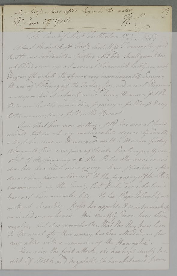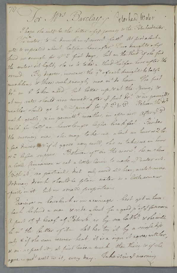 Case of Mrs Barclay who is advised on taking the waters at Peterhead, and sea bathing [may be same patient as Case 417 in 1773]. |