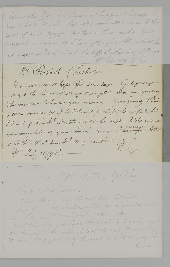[ID:3852] From: Dr William Cullen (Professor Cullen) / To: Mr Robert Chisholm (of Wooler) / Regarding: Mr Robert Chisholm (of Wooler) (Patient) / 1 July 1776 / (Outgoing)
