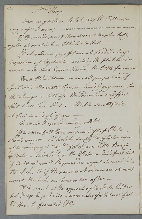 | Summary | Reply, headed for 'Mrs Thorp'. Offering dietary advice and prescriptions for aperients and a glyster. Month and year are certain from Casebook and date is inferred from position. |