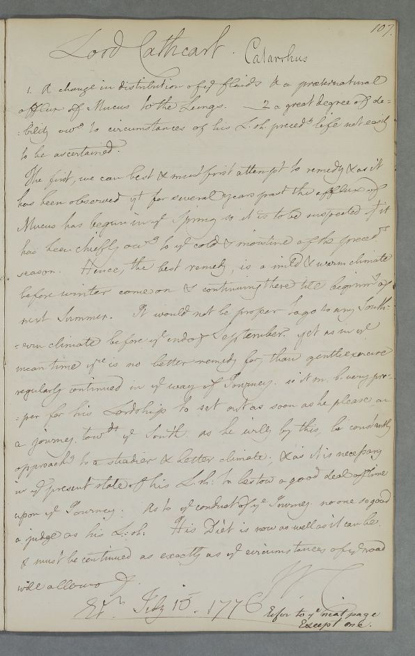 [ID:3865] From: Dr William Cullen (Professor Cullen) / To: Lord Charles Cathcart (Lord Cathcart) / Regarding: Lord Charles Cathcart (Lord Cathcart) (Patient) / 15 July 1776 / (Outgoing)