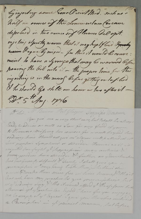 [ID:3886] From: Dr William Cullen (Professor Cullen) / To: [ADDRESSEE UNKNOWN] / Regarding: Mr Thomas Forbes (of Ballogie; of Bulogie) (Patient) / 5 August 1776 / (Outgoing)