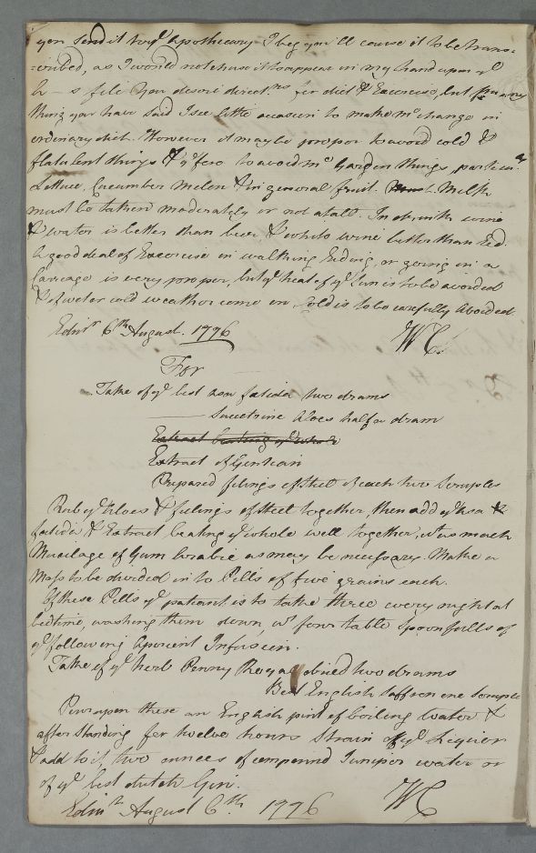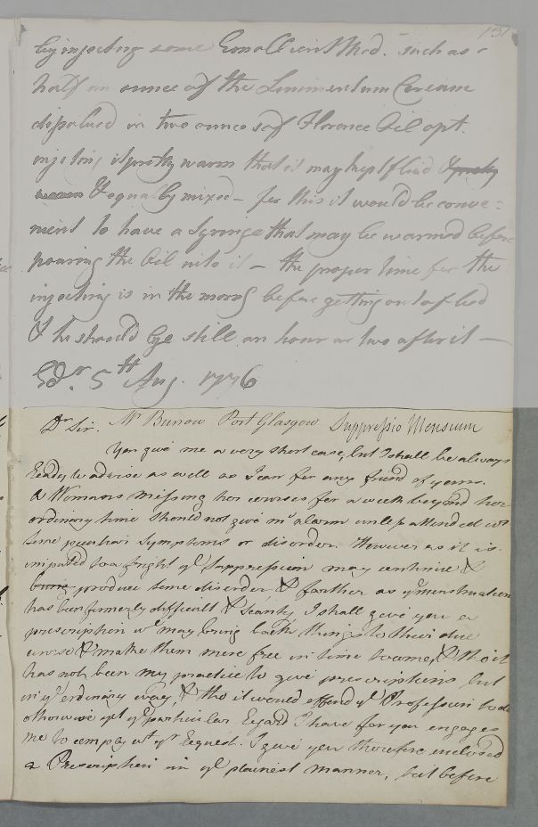 | Summary | Reply headed 'Mr [Edward] Burrow Port Glasgow'. Advice and a recipe for Mrs Burrow whose menstruation, always difficult, has been delayed by a fright. Cullen gives an emmenagogue recipe in plain English, which he admits is unusual, but is done from his regard for the family. He asks Mr Burrow to have it transcribed, so that the apothecary does not recognise Cullen's hand. |